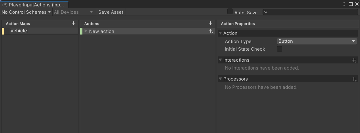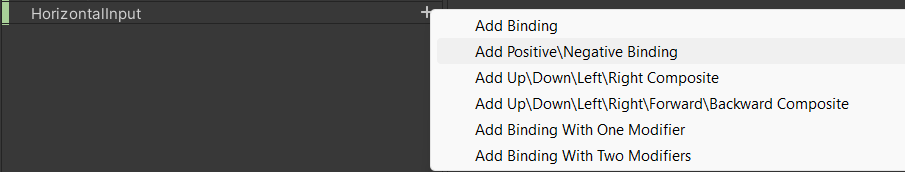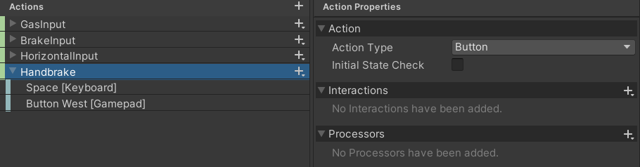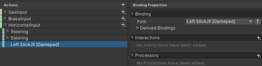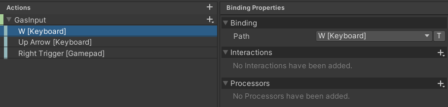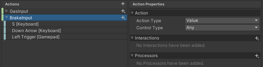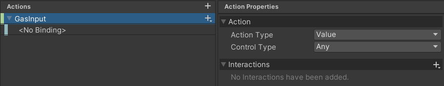 Create new action called "GasInput" and set it's action type to "Value" and Control Type to "Any".
