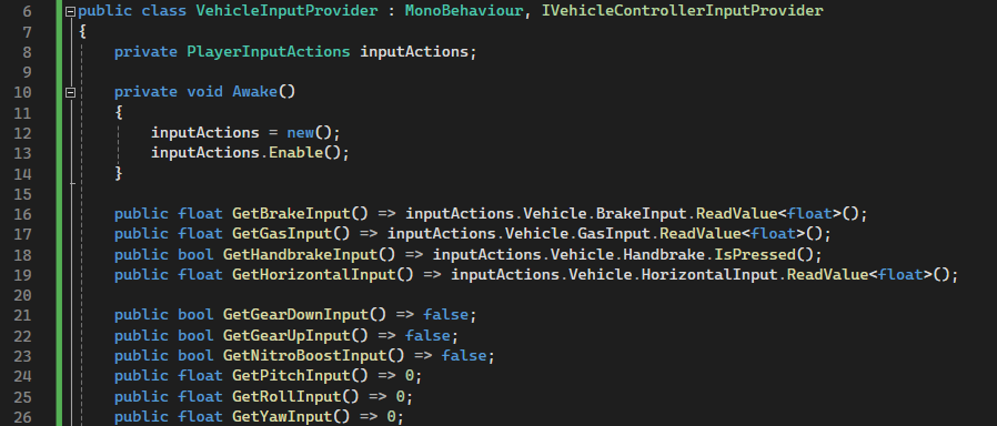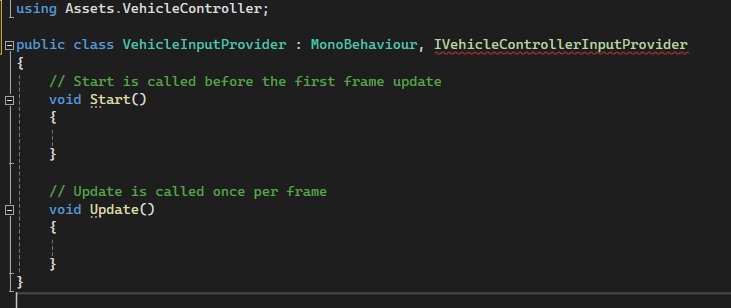 In Visual Studio, click on the IVehicleControllerInput provider, which should have a red wavy underline, press Alt + Enter and select "Implement Interface"