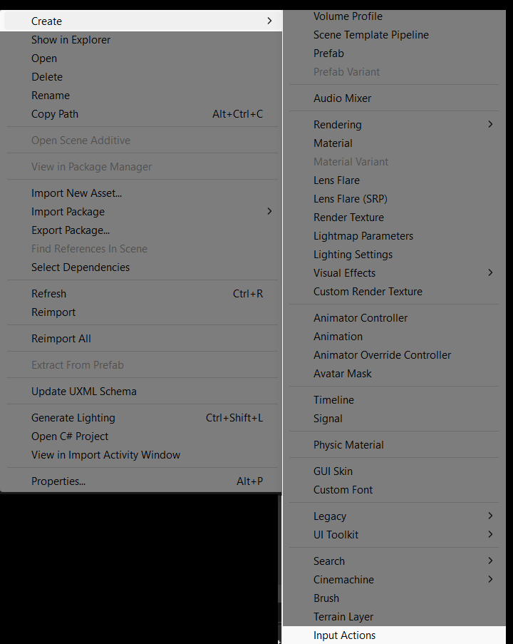 Create input actions asset by doing right-click  in the folder -> Create -> InputActions